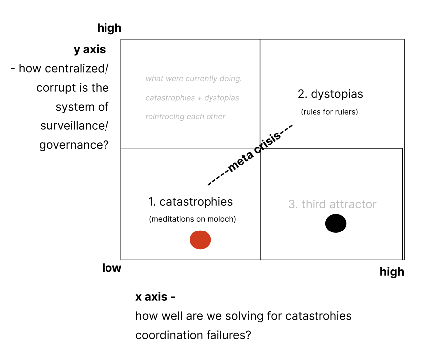 Schmachtenberger frames our current situation as being pulled toward two primary attractors, each representing a distinct trajectory for civilization. The first attractor is collapse—where our interconnected systems fail to address existential challenges like climate change, biodiversity loss, or technological risks, leading to cascading failures across ecological, economic, and social systems. The second attractor is authoritarian control—where centralized power structures emerge in response to increasing chaos, offering stability and security at the profound cost of human freedom, innovation, and dignity.